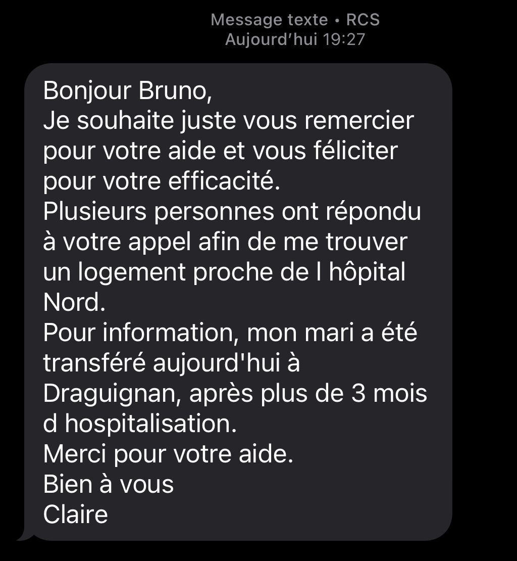 Et puis, il y a toute cette gratitude qu’on reçoit, souvent dès les premiers mots au téléphone, quand j’annonce à un accompagnant qu’il y a une place disponible, tout près de l’Hôpital Nord. Ces remerciements arrivent parfois à des moments inattendus, des semaines ou des mois plus tard. Cet été, alors que de grands incendies ravageaient les collines des quartiers Nord, j’ai reçu plusieurs messages d’anciens passagers qui prenaient des nouvelles, inquiets pour notre maison. Ces attentions-là rappellent que l’hospitalité laisse une trace, des liens qui continuent à vivre, longtemps après le séjour.