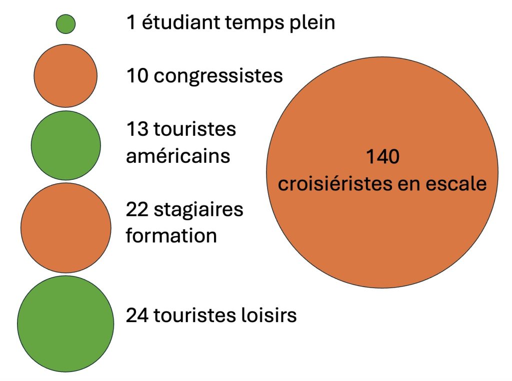 L’étudiant·e générera 5,1 TCo2, les congressistes 8,6 – les américains 17,5 – les stagiaires formation 5,7 – les touristes loisirs 7,3 et les croisiéristes en escale 18,9