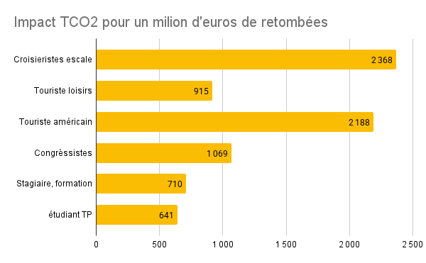 L’empreinte carbone associée varie tout autant. Pour générer ce million d’euros, il faudra compenser 915 tonnes de CO2 pour les touristes loisirs, 2 187 tonnes pour les Américains, 840 tonnes pour les congressistes, 2 368 tonnes pour les croisiéristes, 709 tonnes pour les stagiaires, ou 641 tonnes pour les étudiants.