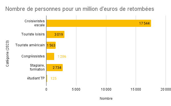 Pour générer un million d’euros de retombées économiques à Marseille, il faut accueillir 3 019 touristes de loisirs, ou bien 1 563 touristes américains, ou bien 1 286 congressistes, ou bien 17 544 croisiéristes, ou bien 2 734 stagiaires en formation, ou bien 125 étudiant·es.